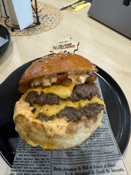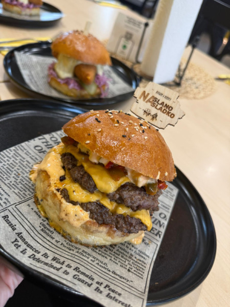2 x 50g smash hovězího mletého masa z farmy Škodovi skvěle doplňuje jedinečnou chuť naší máslové briošky.