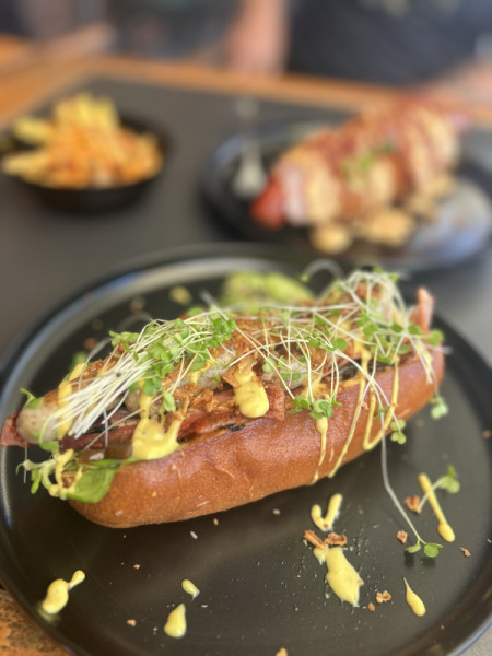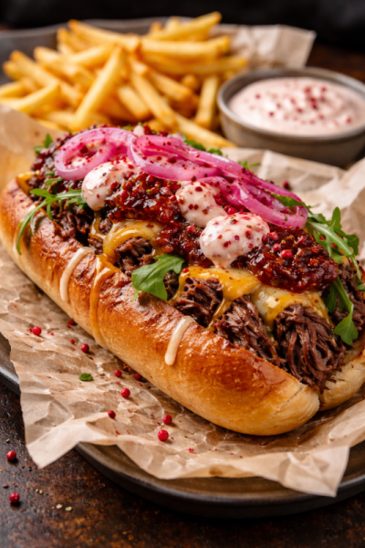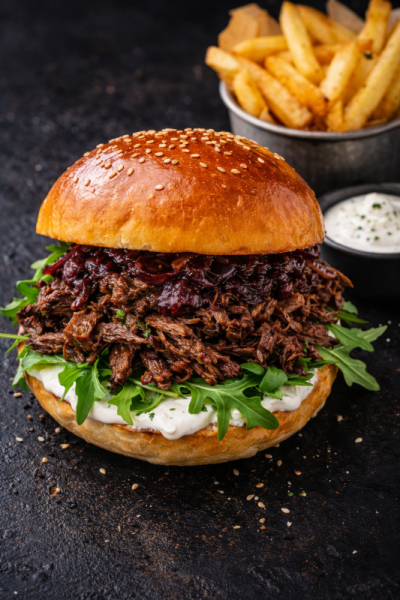 Trhaný hovězí krk z farmy Škodovi skvěle doplňuje jedinečnou chuť naší máslové HotDog žemle sypané mákem.