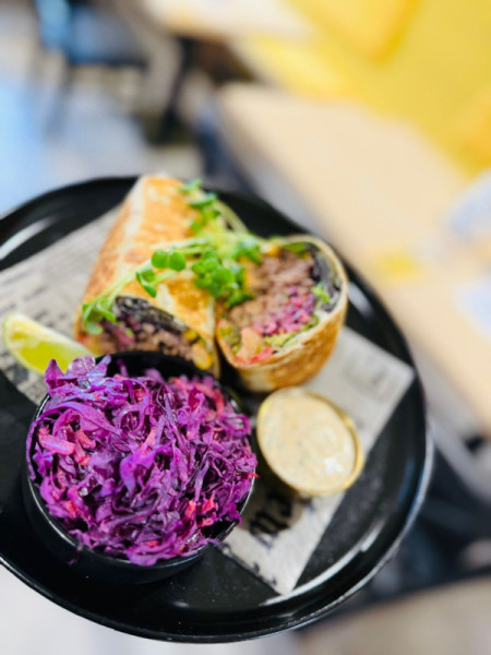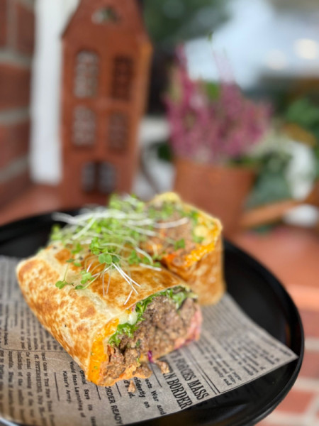 100g Mleté hovězí farma Škodovi z grilu v maxi pšeničné tortille.
